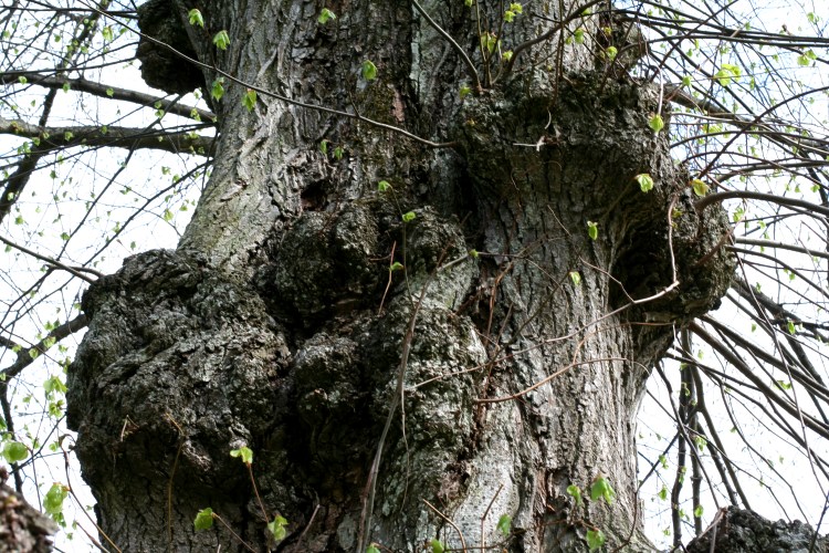 och fyra mindre omgivande stammar. Bilden visar hur skott skjuter ut från den knotiga mittstammen. Det är vår och små skira gröna